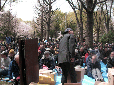 早めの開花でやきもきしましたが、4月5日晴天の中央公園はまだまだ桜が満開。厳しい冬を乗り越えた仲間達が250名も集まり、疲れを癒し、春に向けた気力を取り戻すための花見の会が今年も開催されました。連絡会の花見はいっさいの能書きはなし。スタッフで作った花見弁当をつまみ、でっかい樽でつくった緑茶ハイで「よう、久しぶり」「元気だったか?」「今年も頑張ろうな」とそれぞれの輪を作り和気靄々。次々とつまみ類も配られ、追加の日本酒を振る舞い、最後には現場でのベーコン焼きを振る舞い車座になりながら大きな新宿の仲間の輪が作られました。意外と大酒飲みは少なく、少しの量で顔を赤くし「今日は楽しかったぞ」と楽しそうにねぐらに帰る仲間達の顔は皆笑っていました。