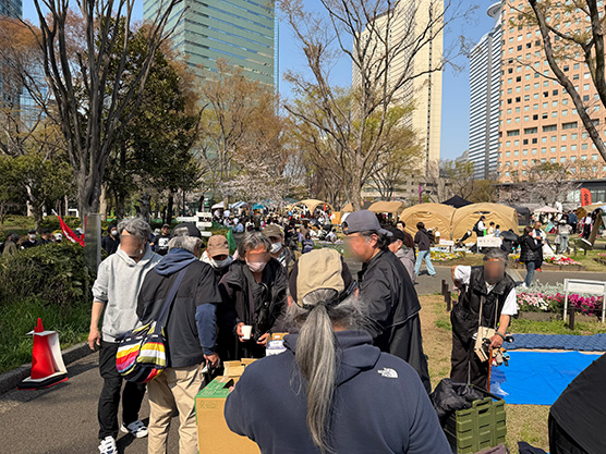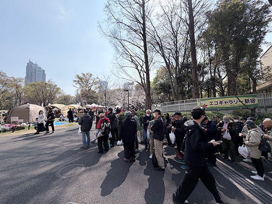 新宿中央公園は子供たちや親子連れのイベントもあって大賑わい。邪魔をしないようにと端の方に陣取りましたが、150名程の仲間が集まったので、とても芝生の上では収容不可。仕方なく区民ギャラリーの道路の方に集まってもらい、そこで特製弁当を配ったり、飲み物やおつまみを配ったりしながら、いつもながら、三々五々のお花見になりました。まあ、それも楽しいもので、冬をどうにか乗り切った仲間と共に、食べたり、飲んだり、談笑したりと、日々の疲れを癒やすことが出来ました。