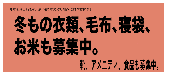防寒着類など冬もの衣類の募集はこれにて終了させていただきます。冬を越すために防寒類はとても重宝されます。毛布、寝袋、防寒着、ホカロンなど、多くの仲間が毎週集まり、それぞれの生活に合わせたものを補充をして来ました。「炊き出しはどこでもやっているが、防寒着や毛布、それと靴があるのは本当に助かるよ」と、仲間の感謝の声も多く聞きました。
