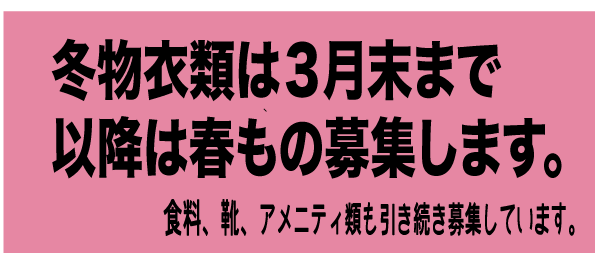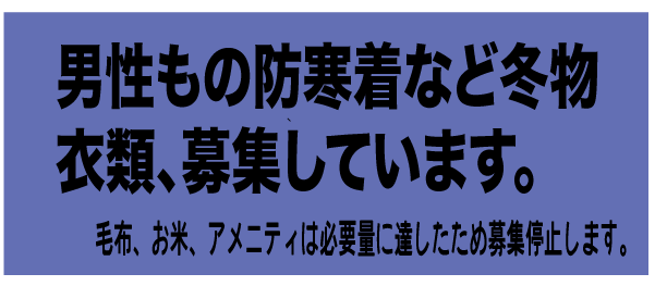 衣類も冬物も含め、募集を開始します。寄付物品。夏もの以外でしたらすべてお受け可能です。