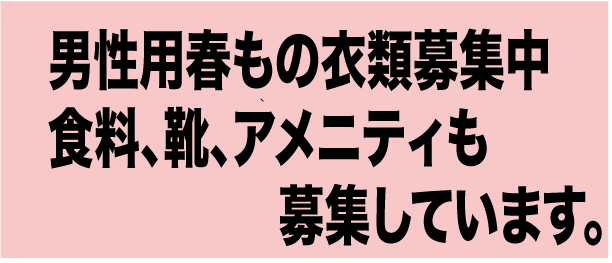これからの季節も、男性もの衣類、靴など生活用品、そしてアメニティ、食料などの募集をしています。引き続きのご協力、よろしくお願い致します。
