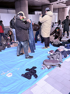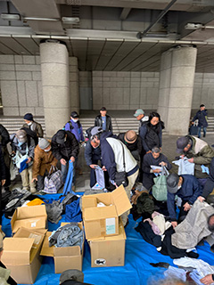 現場では10月から 毛布配布を始め、既に100枚以上を配布しています。寒い夜、凍えて亡くならないよう、一人ひとりに声をかけ、必要であれば毛布をかぶせ、暖を取ってもらっています。