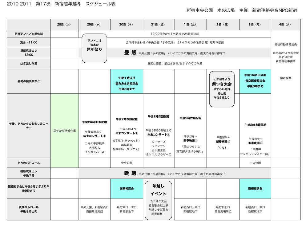 第17次新宿越年越冬事業の年末年始のスケジュールが確定しました。 中央公園「水の広場」にて実施となります。 |