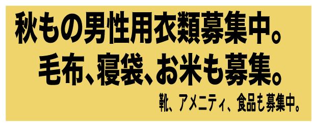 *企業などからの大量物品は受け付けておりません。多くて段ボール箱2箱を目安にお送り下さい。 *当会では女性ものの衣類は原則受け付けておりません。 *お近くの方は持ち込みでもお受けしています。土曜日、祝日をのぞく9時-5時が受付時間となります。 *ご質問は、お気軽にメールも電話しくはでご連絡下さい。 *送料は(お米以外は)元払いでお願いします。